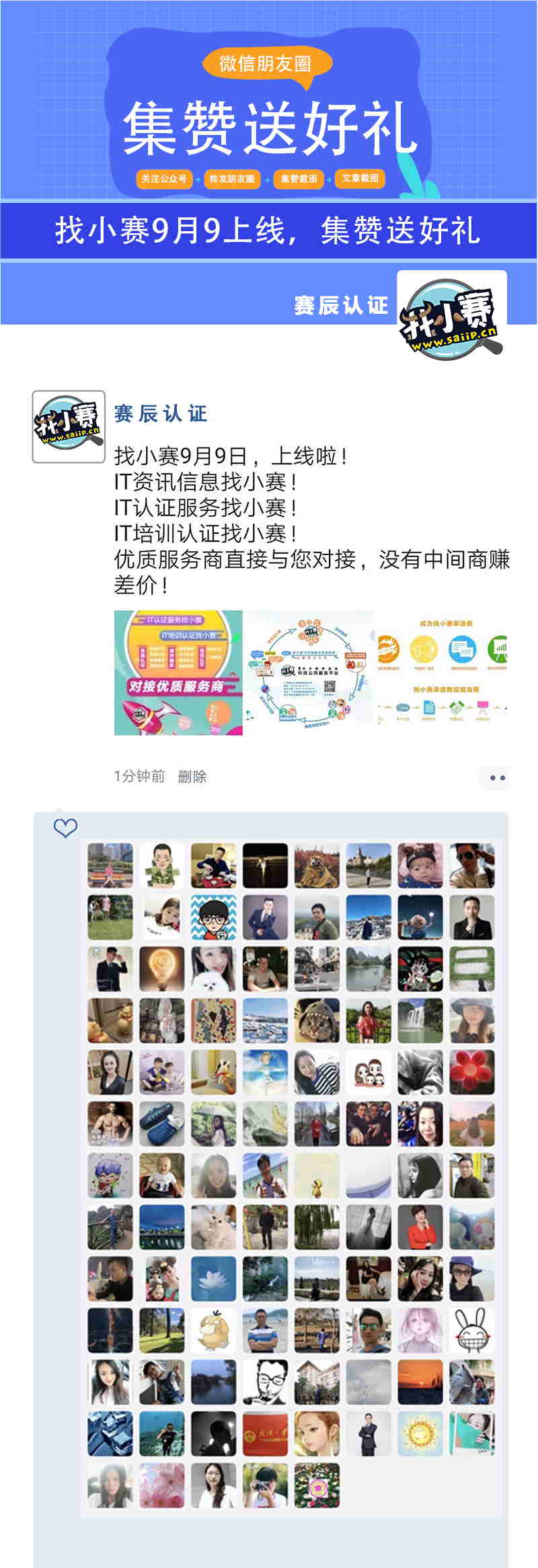 9月9日找小賽平臺試運營,轉發朋友圈集贊即可領好禮!