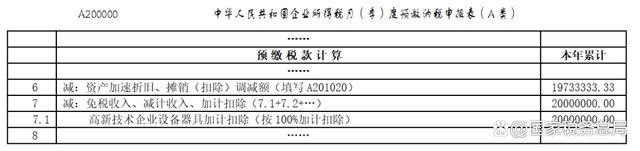 第二步:在《中華人民共和國企業(yè)所得稅月(季)度預(yù)繳納稅申報(bào)表(A類)》(A200000)第7行“減:免稅收入、減計(jì)收入、加計(jì)扣除”下的明細(xì)行次填報(bào)加計(jì)扣除情況。手工申報(bào)的,在明細(xì)行次填寫“高新技術(shù)企業(yè)設(shè)備、器具加計(jì)扣除(按100%加計(jì)扣除)”事項(xiàng)及加計(jì)扣除金額。通過電子稅務(wù)局申報(bào)的,申報(bào)系統(tǒng)自動填報(bào)相關(guān)事項(xiàng)及加計(jì)扣除金額。
